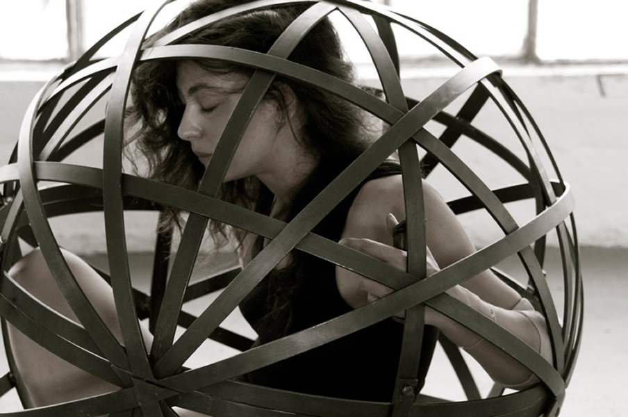 Marilena Zaroulia (Senior Lecturer in Drama, Department of Performing Arts,The University of Winchester) underlines:‘A figure trapped in an iron sphere; a woman, literally and metaphorically the source of life, sits in the ‘centre of the world.’ She attempts to balance – to no avail. She is taken by the power of movement, rolling incessantly. Galileo’s famous exclamation of defiance echoes: ‘and yet it moves’. Indeed, if the earth is moving, how can we stand still? How can we find a balance in a universe that we don’t control? Where is the centre of this universe and how can we reach it?’